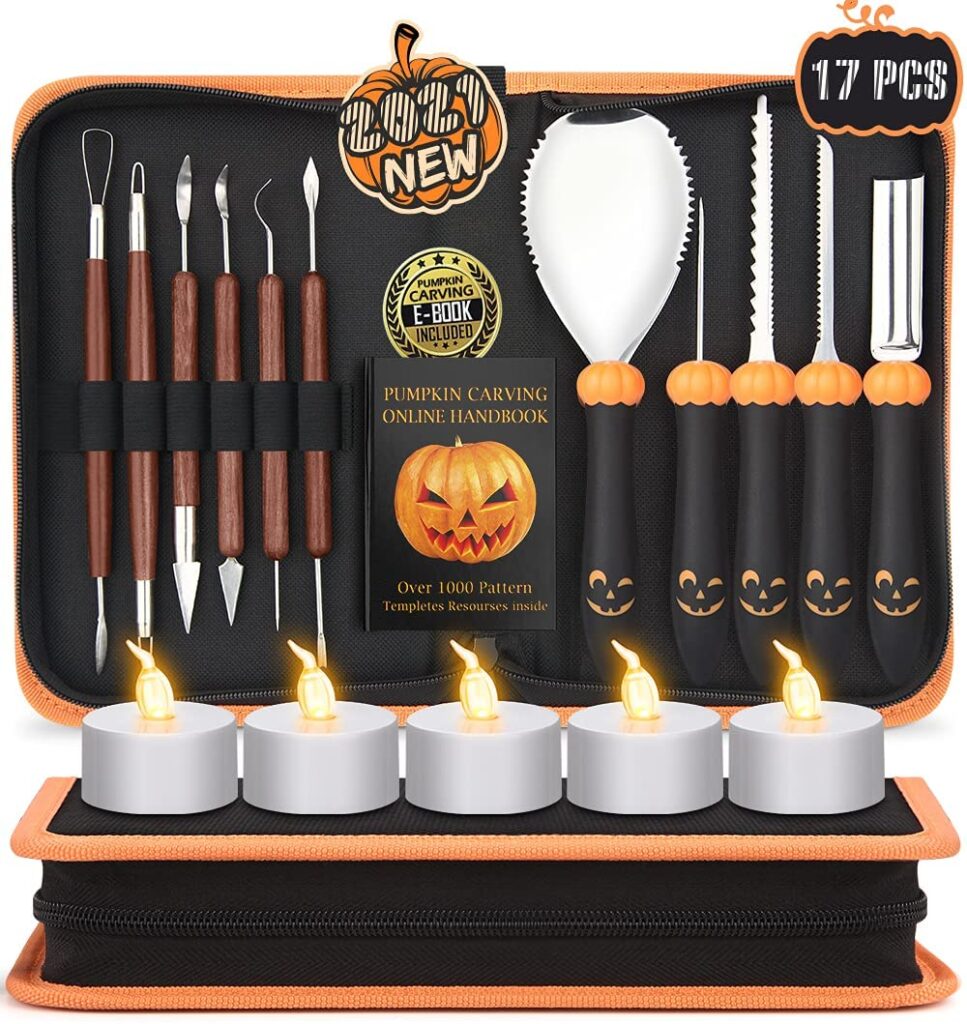 If you are a carving professional than this is the kit for you. This fancy pumpkin carving kit has 17 PCS including 2 saws, cambered etching tool, poker drill, scoops, 6 double-sided stainless detail sculpting, a storage bags, 5 LED candles and 1000 templates stencils E-book. Enjoy!